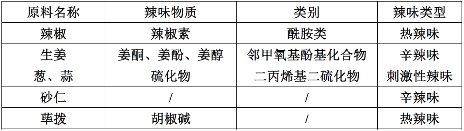 麻辣牛油火锅为什么会让人感觉“辣”?这是因为炒制火锅底料时使用的辣椒、生姜、大蒜、葱和许多香料都具有辣味,而且不同原料的辣味组成和综合风味各不相同,其特点如下表所示: